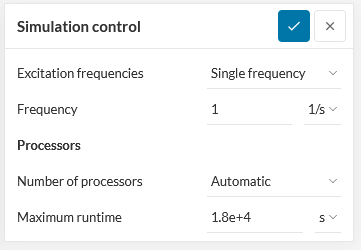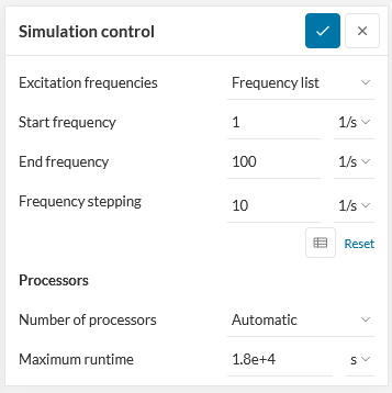 周波数応答解析を行う周波数の値・レンジをここで設定します。 Excitation frequencies を変更することで、単一の振動数か、レンジを設定するか変更できます。また、使用するプロセッサの数についてもここで設定を変更できます。