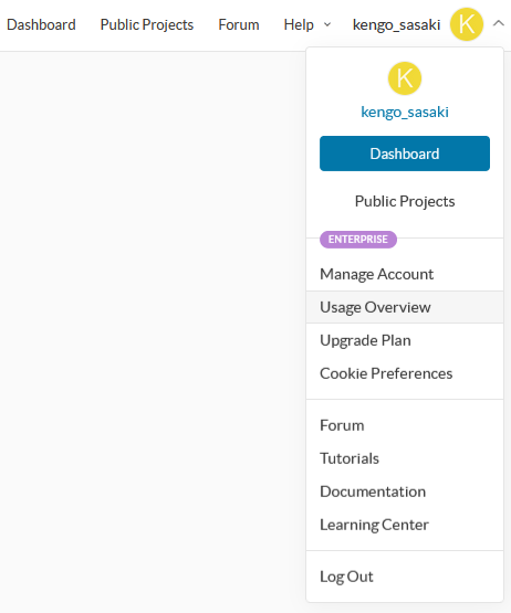 ダッシュボードあるいはワークベンチ上部のアカウント名 → Usage Overview をクリックしてください。