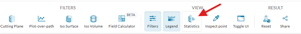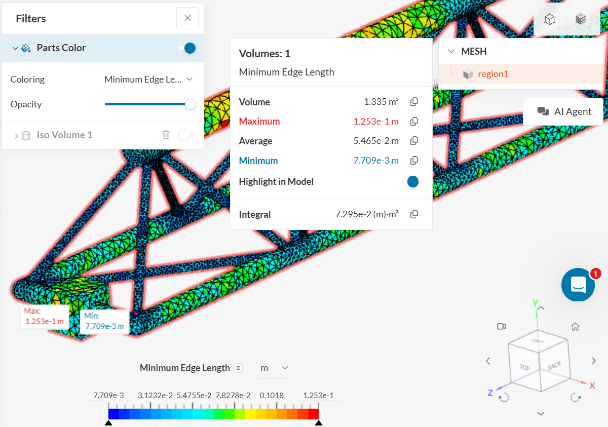 ③ この中でも、最も小さいものを探してみます。 Statistics 機能を使います。ツールバーより、 Statistics をクリックし、最小エッジ長を求めたいボリュームを選択します。統計値のパネルが表示されます。この中で、 Minimum が最小値です。 Highlight in Model のトグルをオンにすると、3Dモデル上に、実際に最小となっているのはどこなのかが表示されます。 Maximum を見ることで、どの要素(セル)が最も大きいかを確認することもできます。