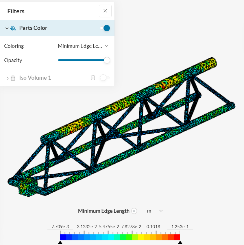 Parts Color より、 カラーコンター表示する項目を変更できます。ここでは、メッシュのサイズについて分析したいので、 Minimum Edge Length を選択します。これにより、各要素(セル)のエッジのうち、最小エッジの長さがカラーコンター図で表示されます。