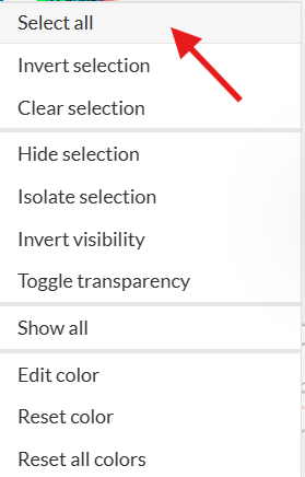 なお、ボリュームを選択する際、複数のボリュームも選択できます。部品数が多いアセンブリで、モデル全体を選択したい場合は、右クリック→ Select all を使用すると、すべて選択できます。ボリュームの数が多い場合、統計値が表示されるまでに少し時間がかかる場合がございます。