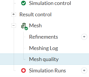 ① シミュレーションツリーの Mesh を展開します。すると、 Mesh に関する詳細項目が表示されますので、 Mesh quality をクリックしてください。